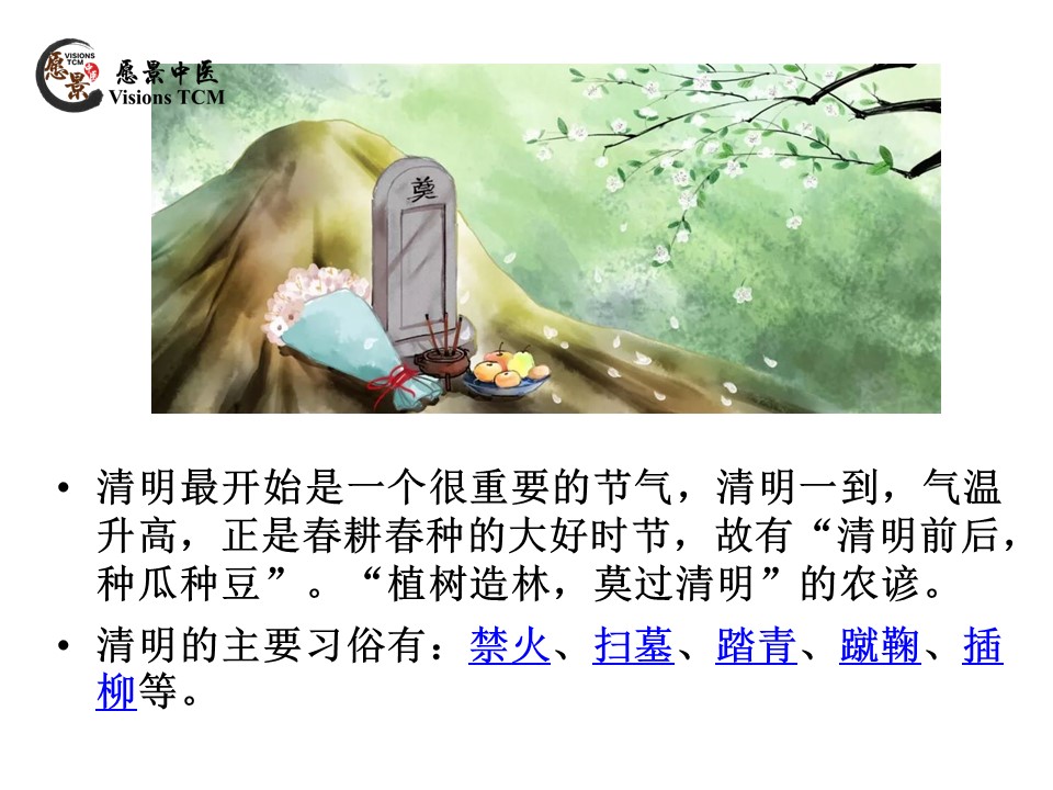 清明扫墓是中华民族敦亲睦族以及行孝品德的具体表现。此外,清明节还有踏青、放风筝、荡秋千等放松身心的活动。春天外出,亲近自然,可疏通冬日的气血积郁,缓解精神压力,使心胸开阔,心情愉悦,能使人体正气增强,提高对疾病的抵抗力。