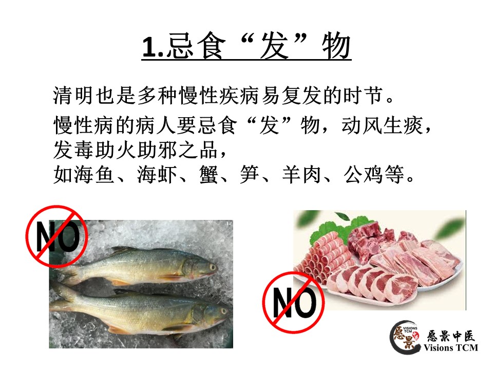 1) 清明也是多种慢性疾病易复发的时节。慢性病的病人要忌食“发”物,动风生痰,发毒助火助邪之品,如海鱼、海虾、蟹、笋、羊肉、公鸡等。