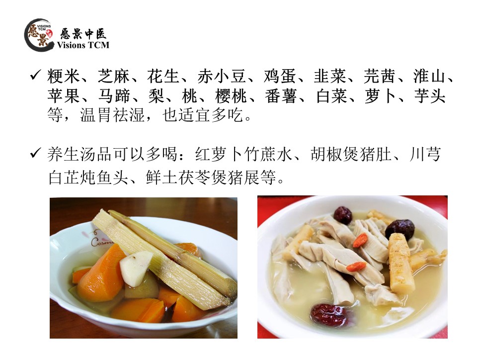 2) 粳米、芝麻、花生、赤小豆、鸡蛋、韭菜、芫茜、淮山、苹果、马蹄、梨、桃、樱桃、番薯、白菜、萝卜、芋头等,温胃祛湿,也适宜多吃。