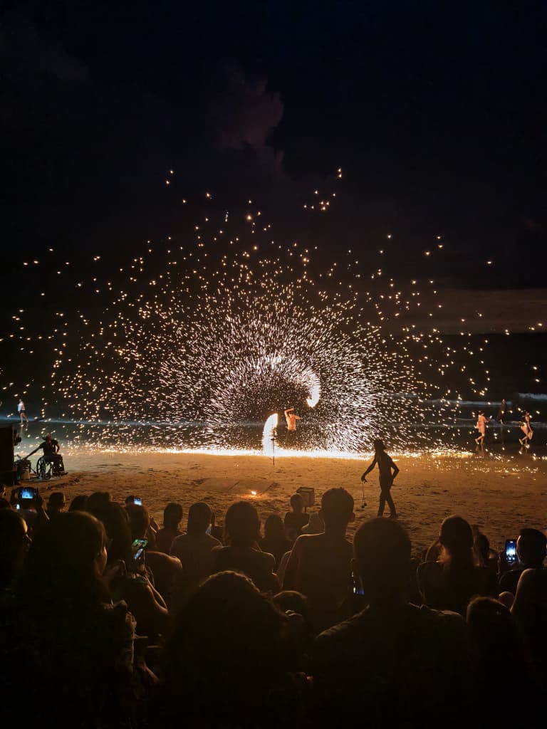 伴着绝美的夕阳与晚霞,大家一起并肩坐在海边阶梯上,欣赏着火舞表演,海风轻拂,夕阳与晚霞铺满了整个天际。火舞在眼前翻飞,火光与天边的色彩交织,映照出一片梦幻。此刻,心境宁静却又澎湃,仿佛一切烦忧都随海浪远去,只剩下人与自然最纯粹的交流与感动。