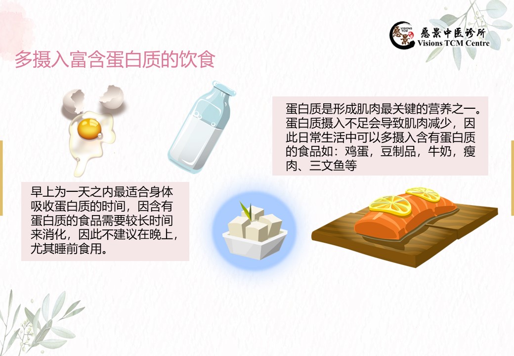 蛋白质是形成肌肉最关键的营养之一。蛋白质摄入不足会导致肌肉减少,因此日常生活中可以多摄入含有蛋白质的食品如:鸡蛋,豆制品,牛奶,瘦肉、三文鱼等。