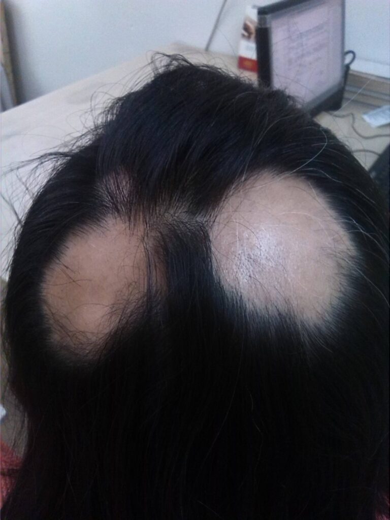 The affected scalp appears normal without inflammation or subjective symptoms. The disease progresses slowly and may resolve on its own or recur. If all the hair on the scalp falls out, it is called total alopecia; if all body hair is lost, it is called universal alopecia. This condition is related to immune system disorders and sudden increases in stress.