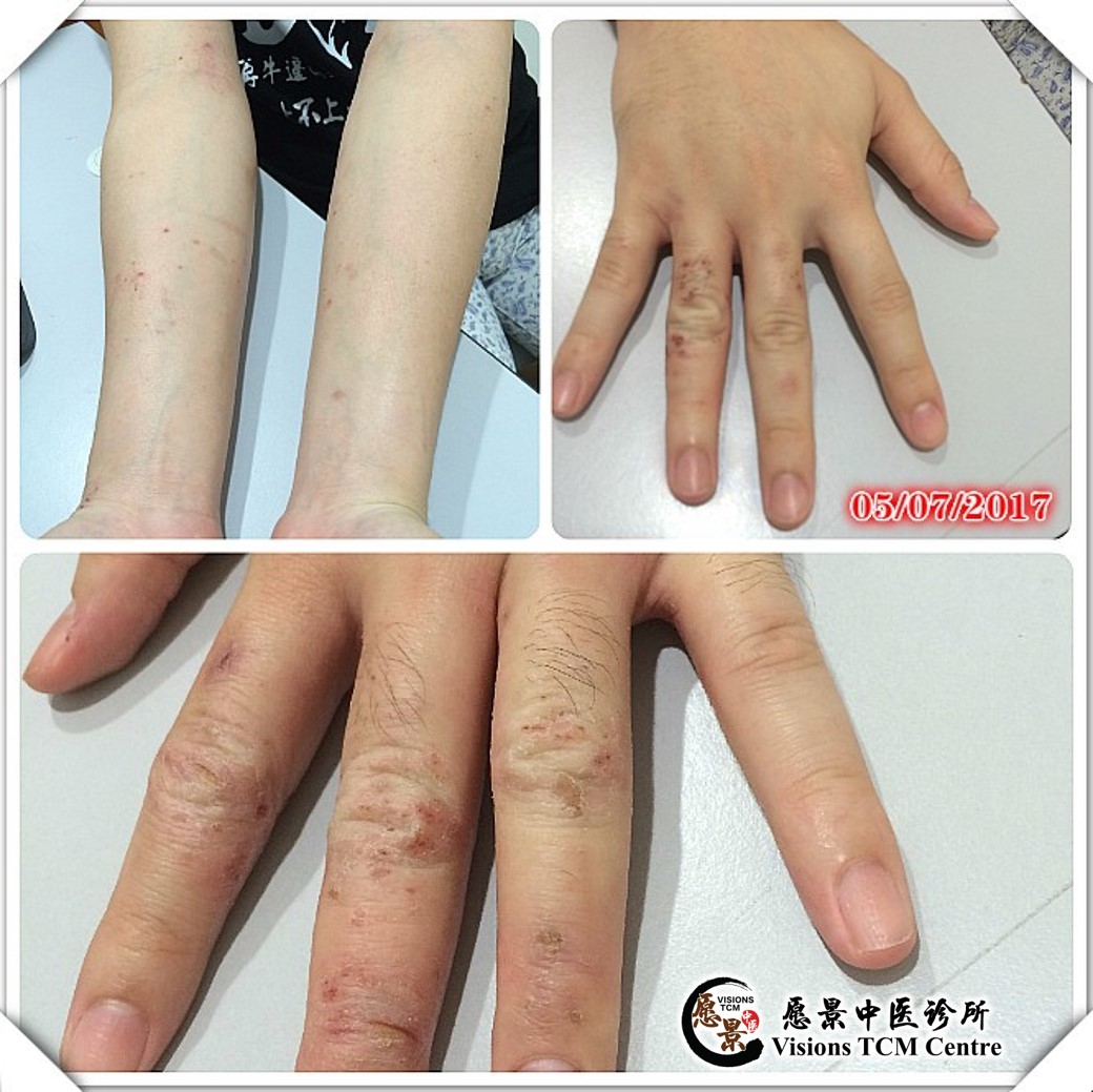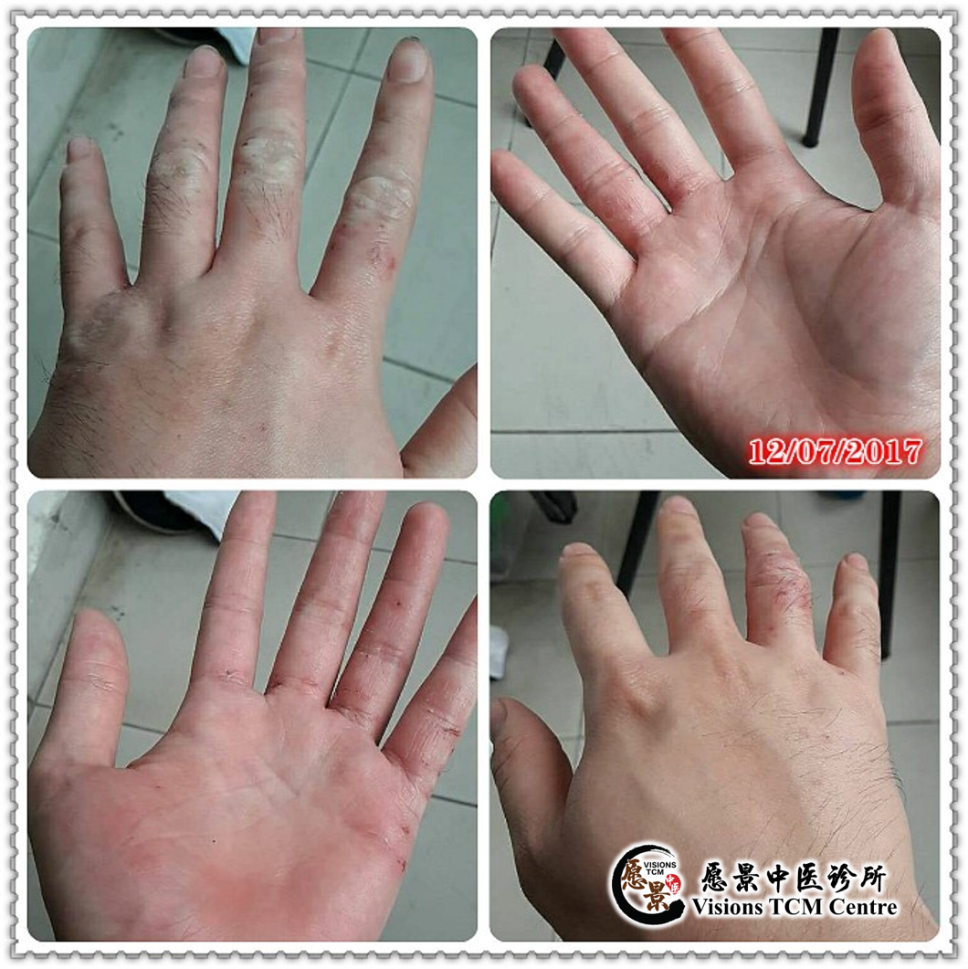 On the first day visit, the patient outlook given me an impression that he is fit and strong. His skin is fair with some pinky color despite the wound of the rashes and inflammation on the arm, the palm of hands and back of the palm. I asked: “Do you feel pain?” He answered: “Pain and Itchy.” My mind is curious, why the young man caught by this skin problem? After some details explanation, I come to understand that his career is pastry chef. Every day, he will soak his hand in the dough mixed with water and oil for eight hours. I asked again: “Do your colleagues having the skin problems?” He said: “Nope.”