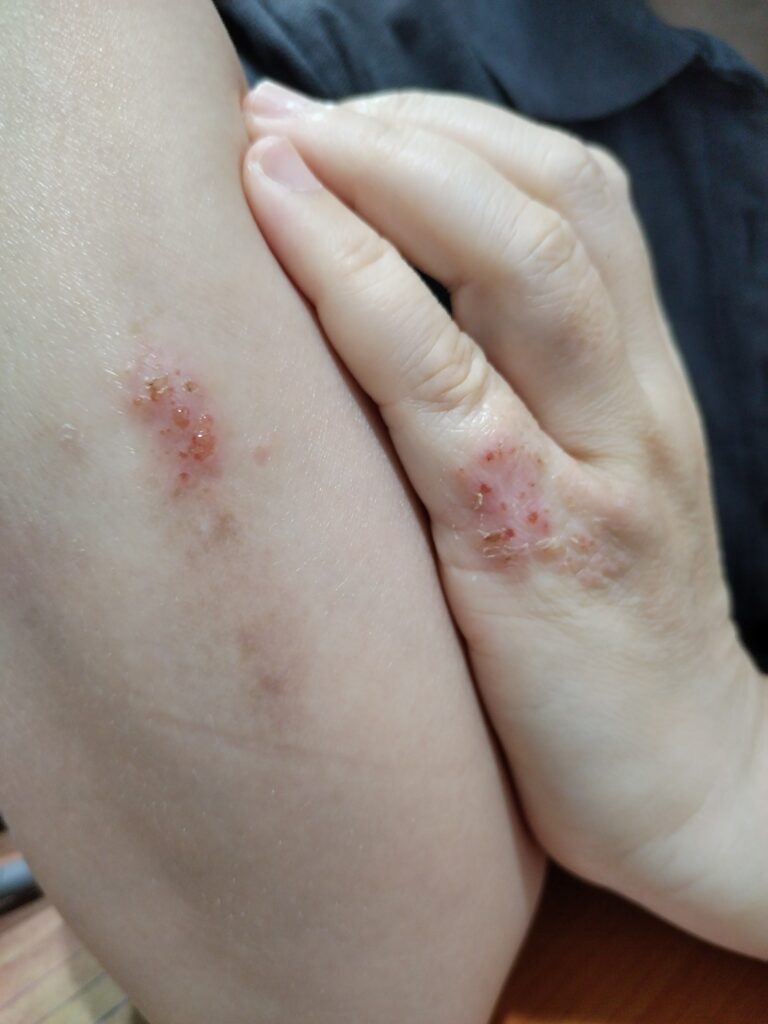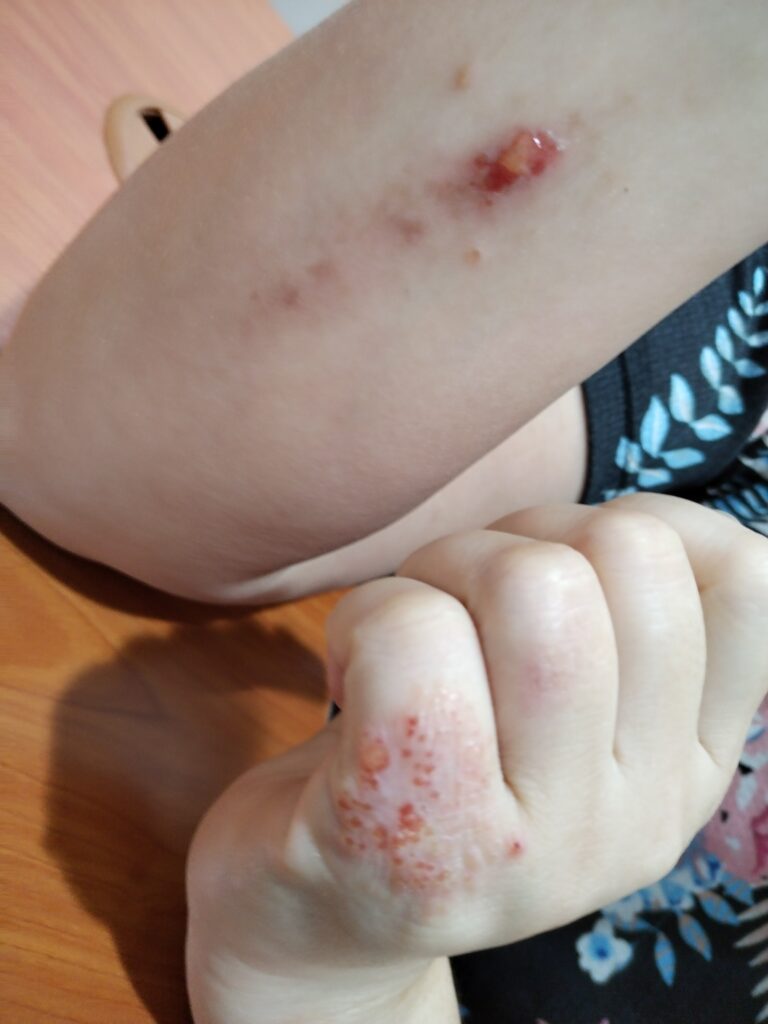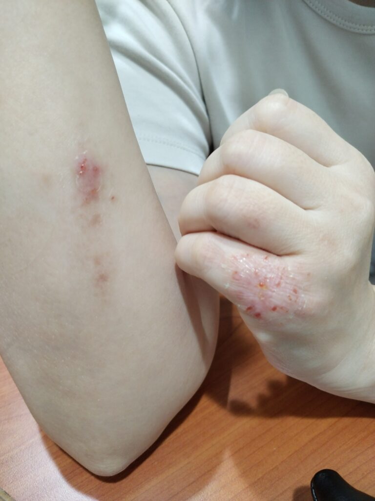 The little finger inflammation has started to recover. However, she went out for lunch with family and found out the dermatitis issue worsen again. Some pus flowing out around right arm near the elbow.
