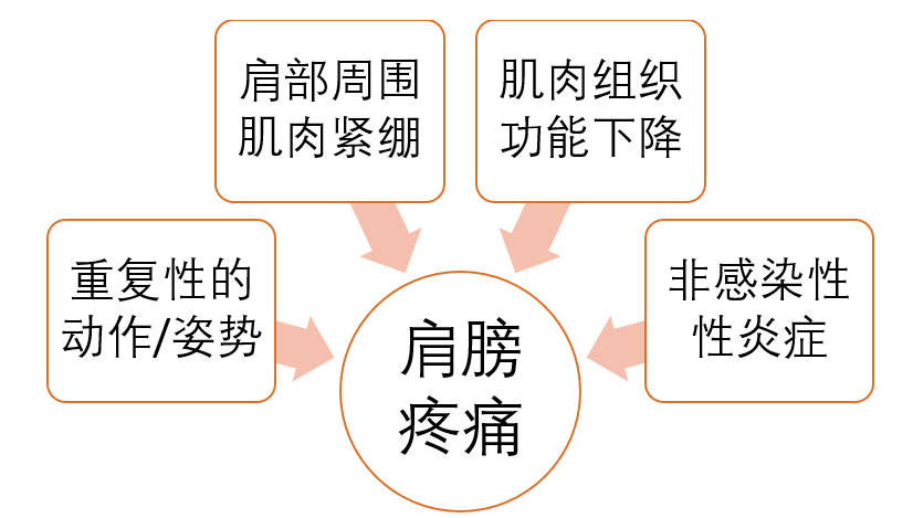 这类的损伤是由于频繁重复性的某个动作或姿势肩部周围的肌肉组织持久僵硬紧绷并导致该处的肌肉组织功能下降、产生非感染性性炎症,出现肩部疼痛。