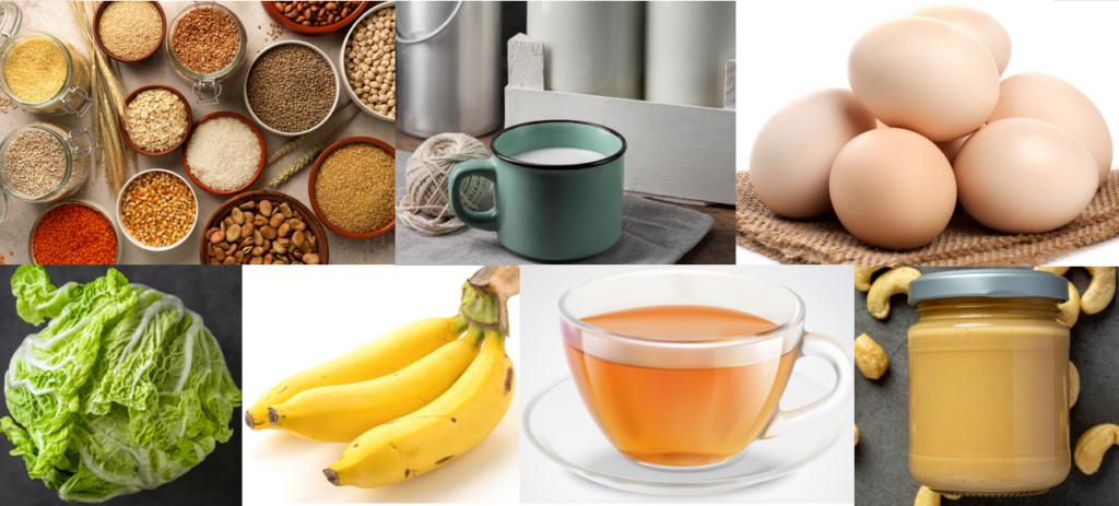 Beras (termasuk beras putih, jagung, millet, pulut dll.), gandum (termasuk barli, gandum, oats, quinoa, bijirin dll.), produk berasaskan tepung (tepung gandum putih, mi, tepung jagung, roti kukus, roti, biskut), biskut soda, pastry mentega, kanji, macaroni, kentang, ubi keledek, yams, mihoon dll.