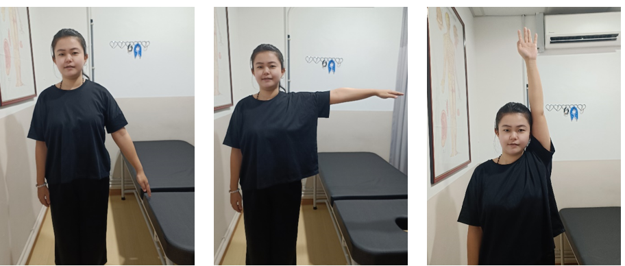 1.Mengangkat tangan berhala atas: berdiri tegak, mengangkat tangan dari bawah ke atas, lengan cuba untuk mendekati telinga sepenuhnya atau melebihi bahagian atas kepala. Meminta perhatian adakah anda rasa sakit atau pergerakan terhad yang jelas.