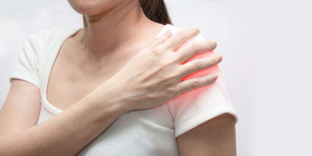 - Pergerakan sendi bahu terhad dapat dirasakan dengan jelas.