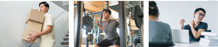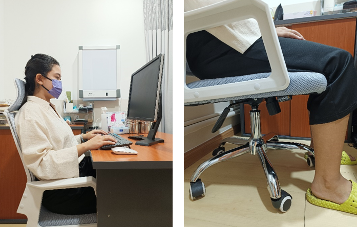 - Semasa duduk di kerusi, memastikan punggung duduk merangkumi seluruh kerusi, belakang menyandar dekat untuk menjaga tulang belakang dalam kedudukan tegak.