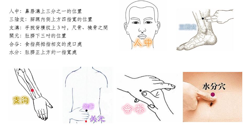 穴道按摩的方式,按壓人中、三陰交、支溝、合谷、關元、水分等穴位,也有助於排除身體淤積的水分。