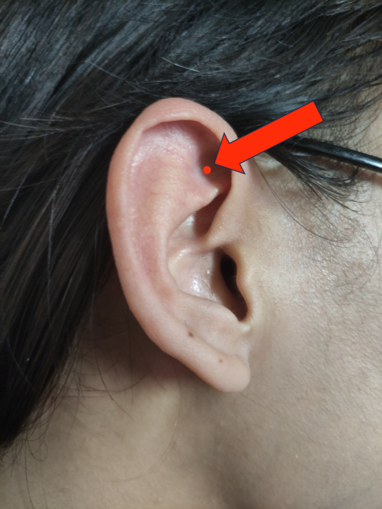 第一个是耳朵上的子宫穴,位于三角窝前1/3的下部,三角窝底之内侧凹陷处。
