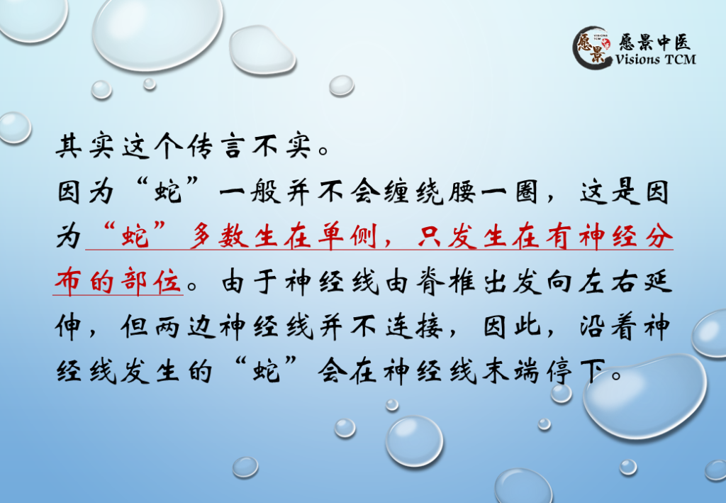 其实这个传言不实。因为“蛇”一般并不会缠绕腰一圈,这是因为“蛇”多数生在单侧,只发生在有神经分布的部位。由于神经线由脊椎出发向左右延伸,但两边神经线并不连接,因此,沿着神经线发生的“蛇”会在神经线末端停下。当然,也有极少数人会有同时“多处生蛇”的情况,但是一般也不会危及生命。