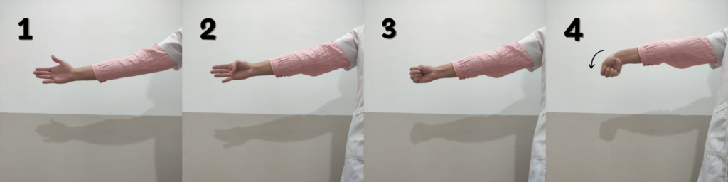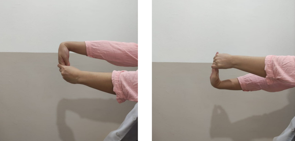 第一步,将手腕向前伸直,拇指朝上尾指朝下。